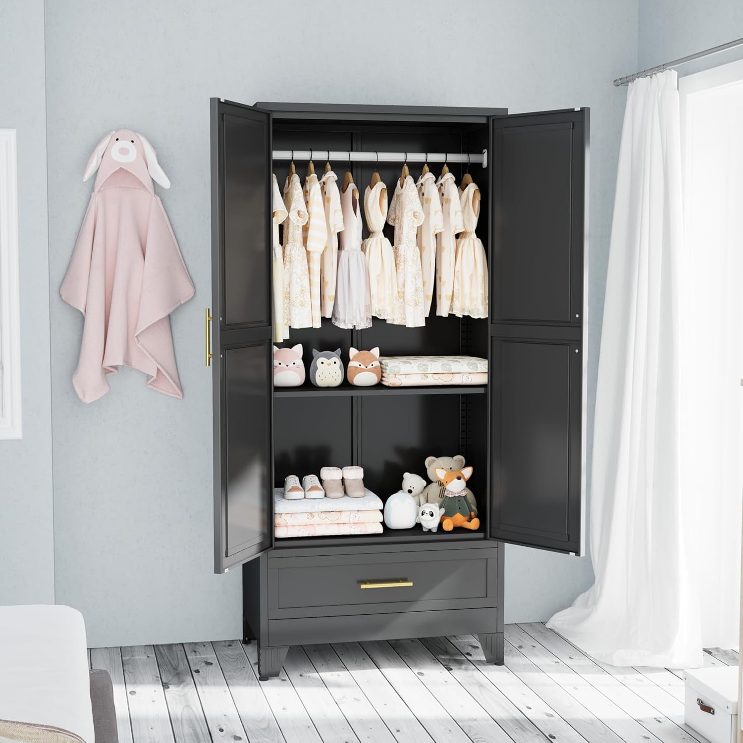 The first impression of the armoire’s design is that it’s incredibly sleek. The black color adds a modern and sophisticated touch, making it a good match for my bedroom’s aesthetic. I was concerned that a metal wardrobe might give off an industrial vibe, but this one manages to look more contemporary while still being functional.