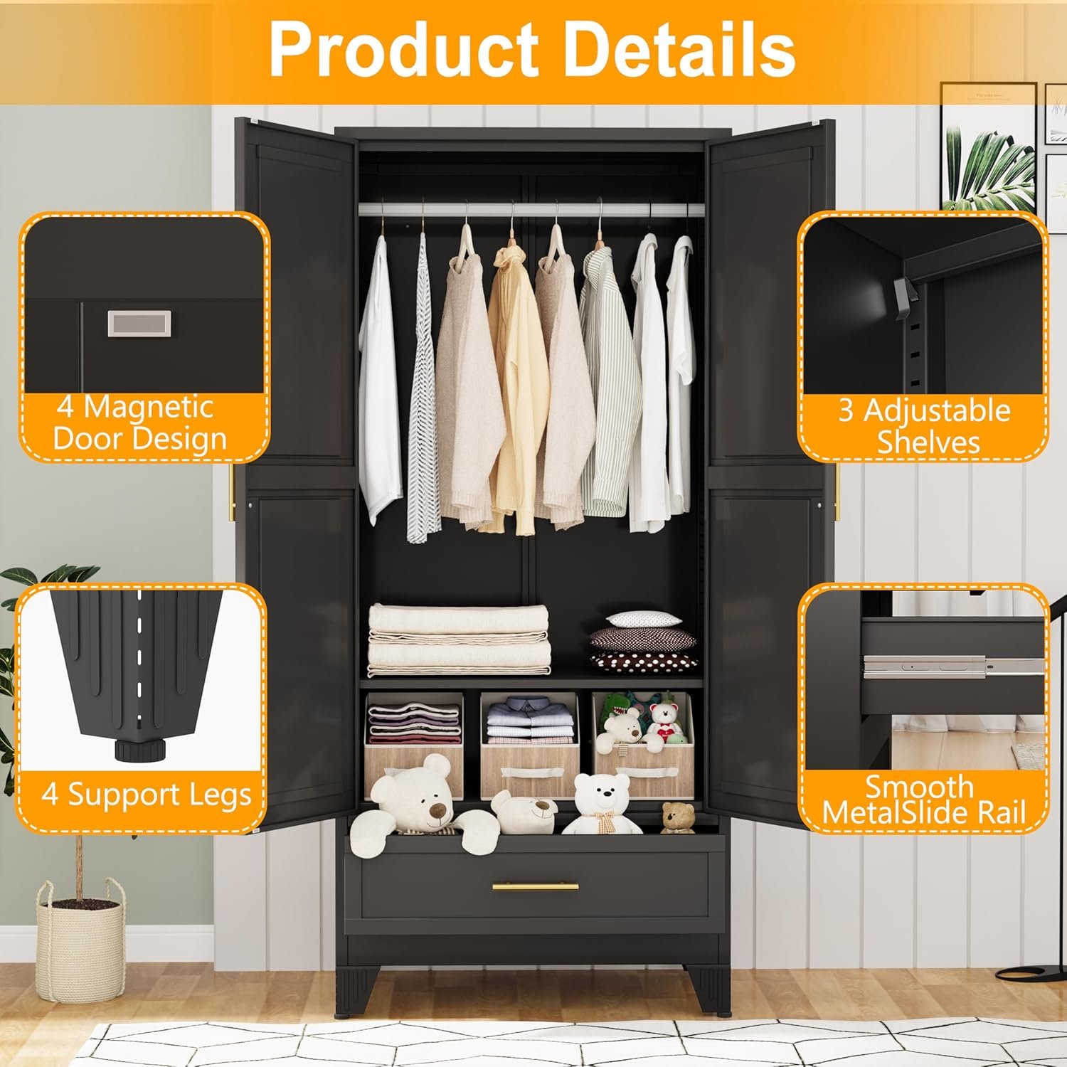 | Storage Options | Hanging pole, adjustable shelves, drawer |