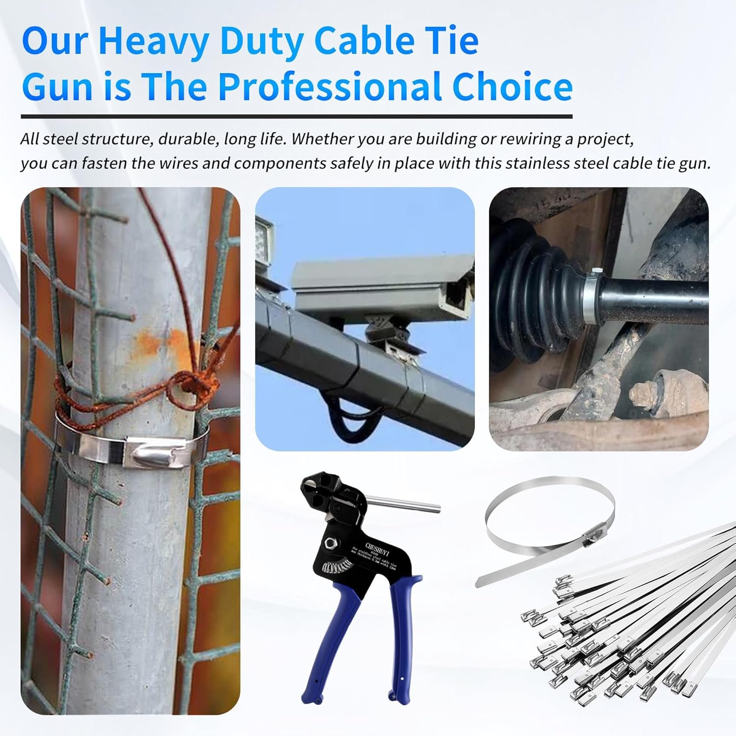 Timely Delivery: The product was delivered promptly, which is always appreciated.Strength and Durability: The stainless steel zip ties included in the kit are impressively strong. They provide a robust alternative to regular plastic zip ties. Whether you’re securing cables outdoors or need a heavy-duty fastening solution, these metal ties won’t disappoint.Ease of Use: The tie gun itself is straightforward to operate. It’s as easy to use as regular zip ties, making it accessible even for those new to these tools.Heavy-Duty Design: This kit is built for tough tasks. If you’re dealing with applications where plastic zip ties might weaken due to weather fluctuations or other factors, the Heavy Steel Tie Tool is an excellent choice. It’s designed to withstand the elements and provide a long-lasting solution.Versatility: While zip ties are often considered temporary fixes, these stainless steel ties offer versatility. Use them when you need a permanent, reliable fastening solution. Whether it’s securing cables, organizing equipment, or even creating a sturdy support structure, these metal ties have you covered.In summary, the Heavy Steel Cable Tie Tool is a must-have for anyone who values durability, strength, and versatility. Not sure what to get the person who has every tool, then this is the gift. Might not need it now, but they will have it when they need it.I hope this review helps potential buyers make an informed decision! 🛠️💪