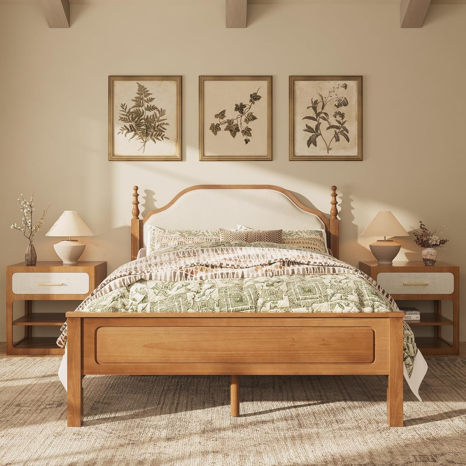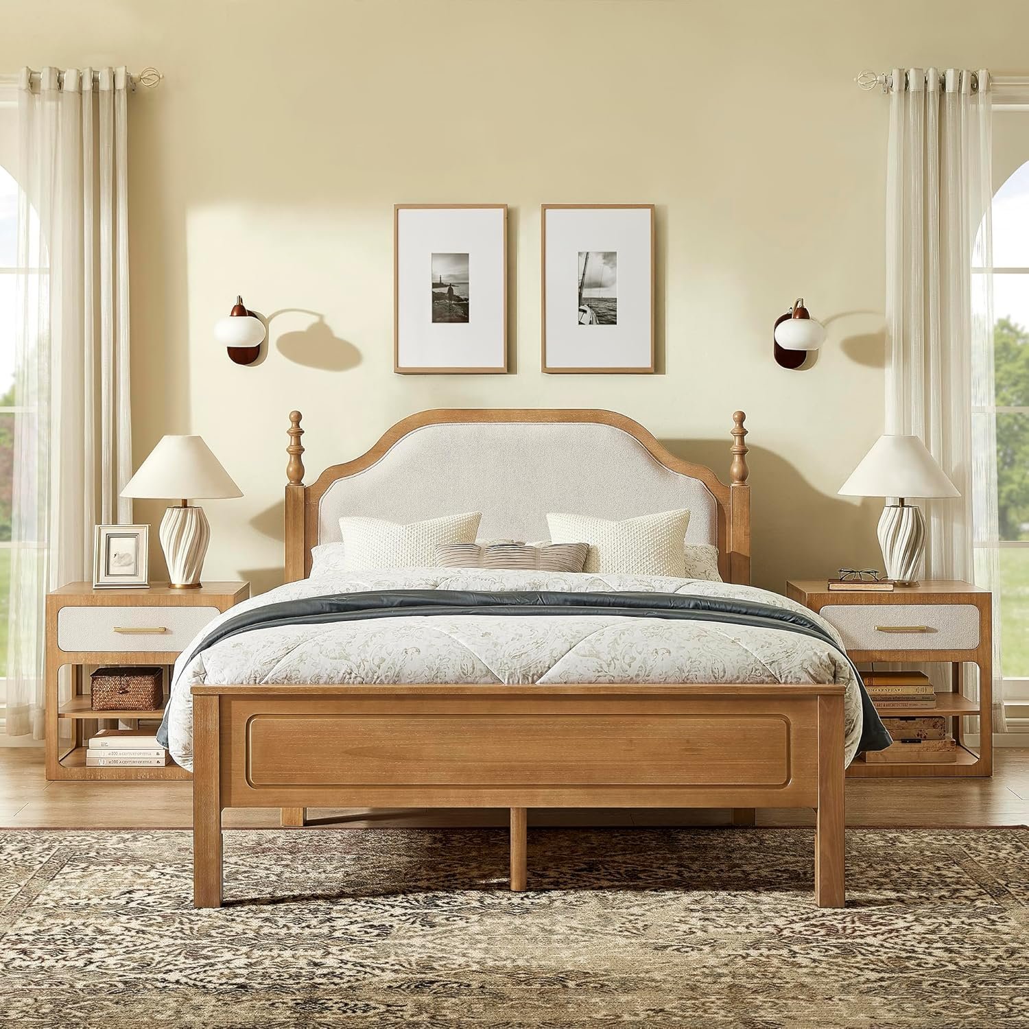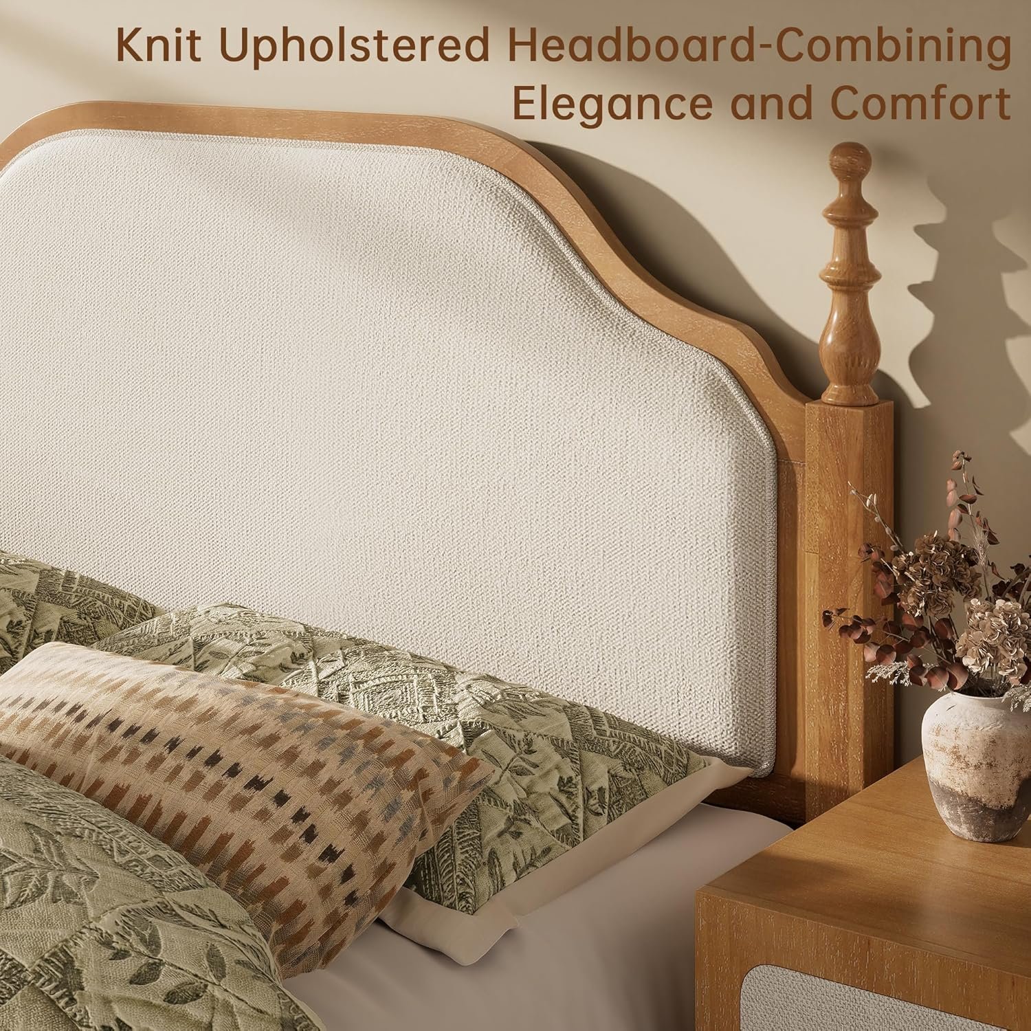 Morden Fort Solid Wood Queen Bed Frame with Headboard and 2 Nightstands,Platform Bed Frame with Knit Upholstered Headboard,Heavy Duty Bed Frame with Wood Slats Support,No Box Spring Needed-Light Brown