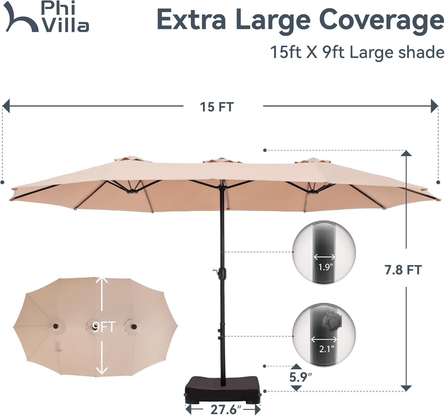 PHI VILLA 15ft Large Patio Umbrellas with Base Included, Outdoor Double-Sided Rectangle Big Market Umbrella with Stand, Outside Umbrellas for Poolside Lawn Backyard, Beige