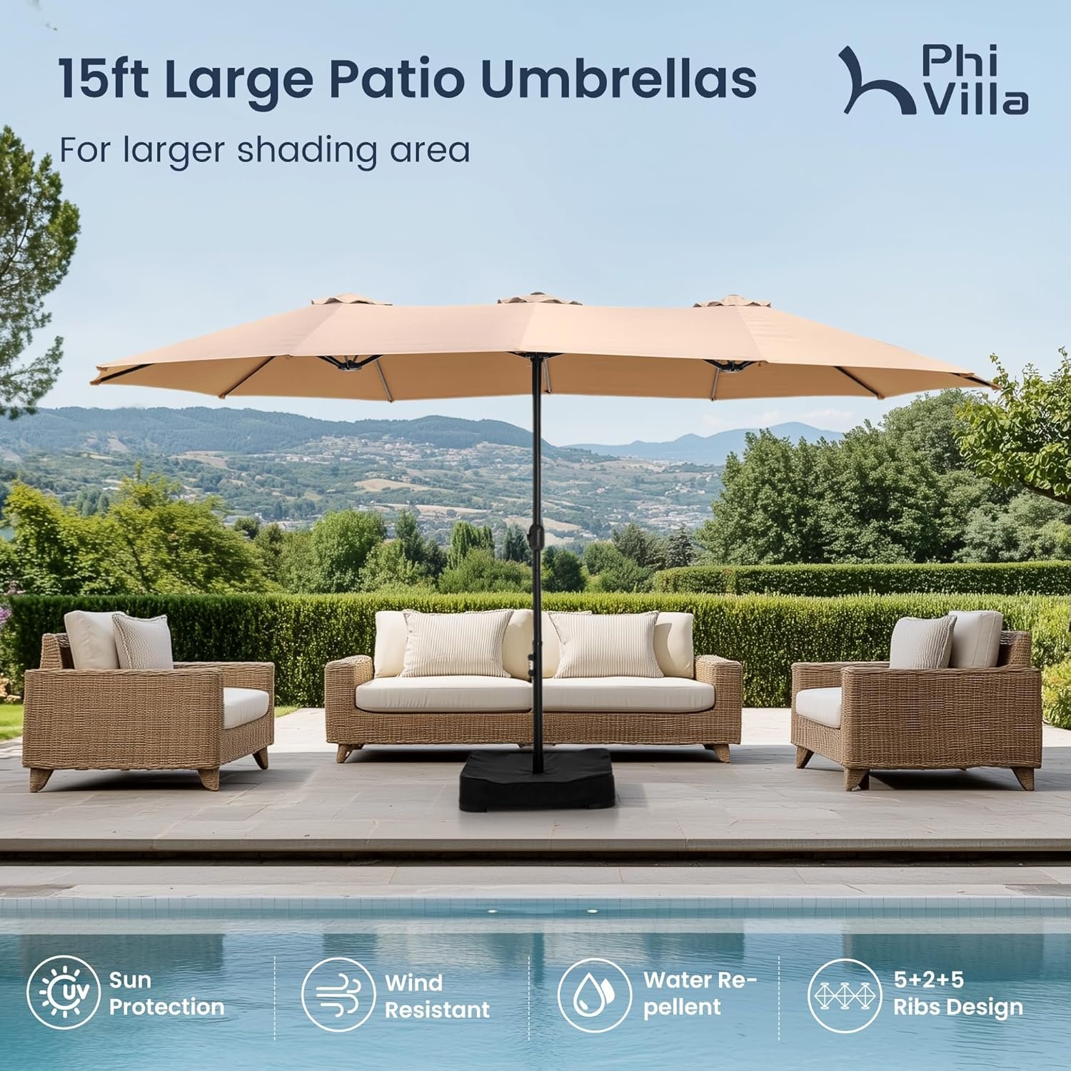 12 reviews for PHI VILLA 15ft Large Patio Umbrellas with Base Included, Outdoor Double-Sided Rectangle Big Market Umbrella with Stand, Outside Umbrellas for Poolside Lawn Backyard, Beige